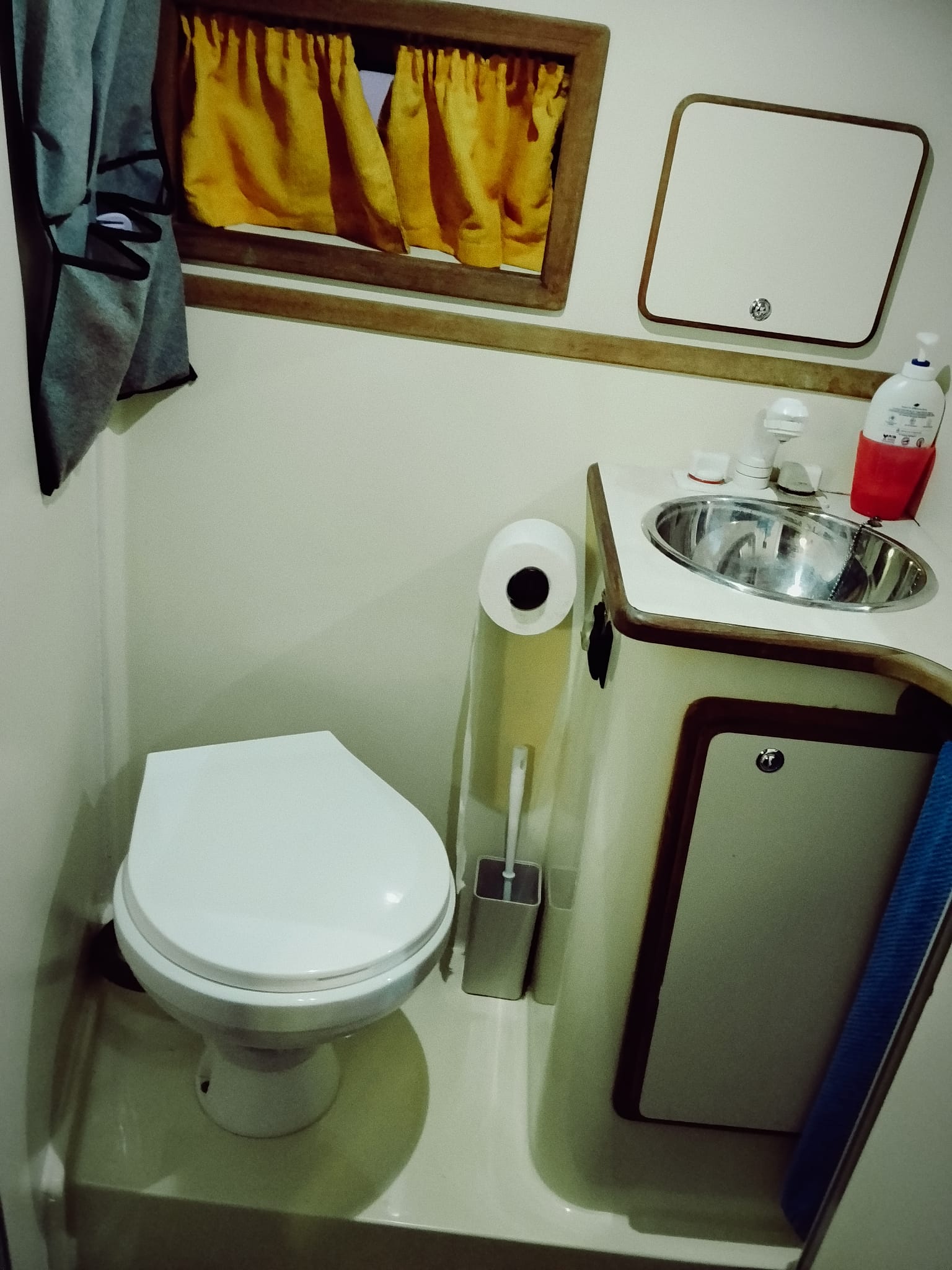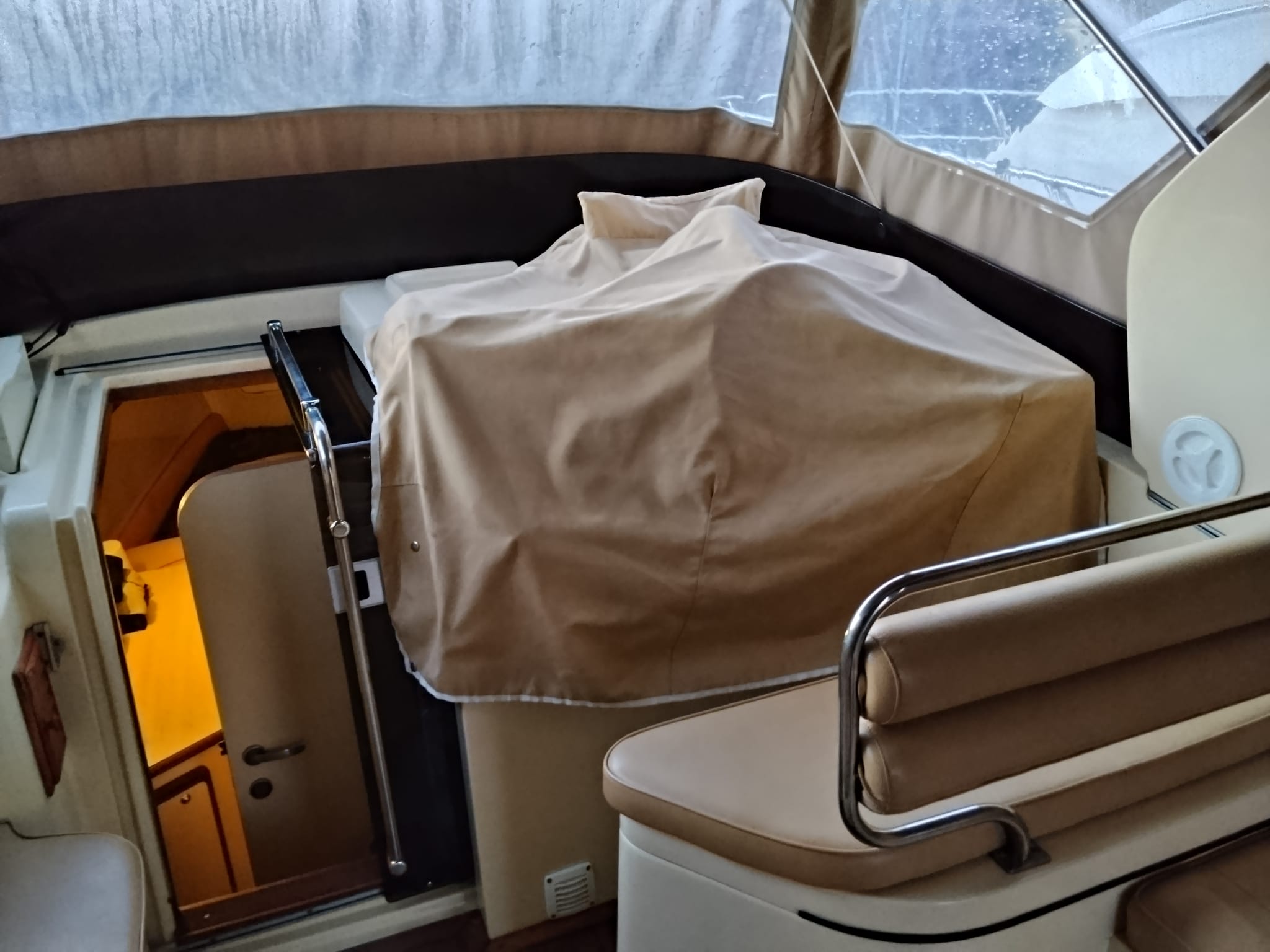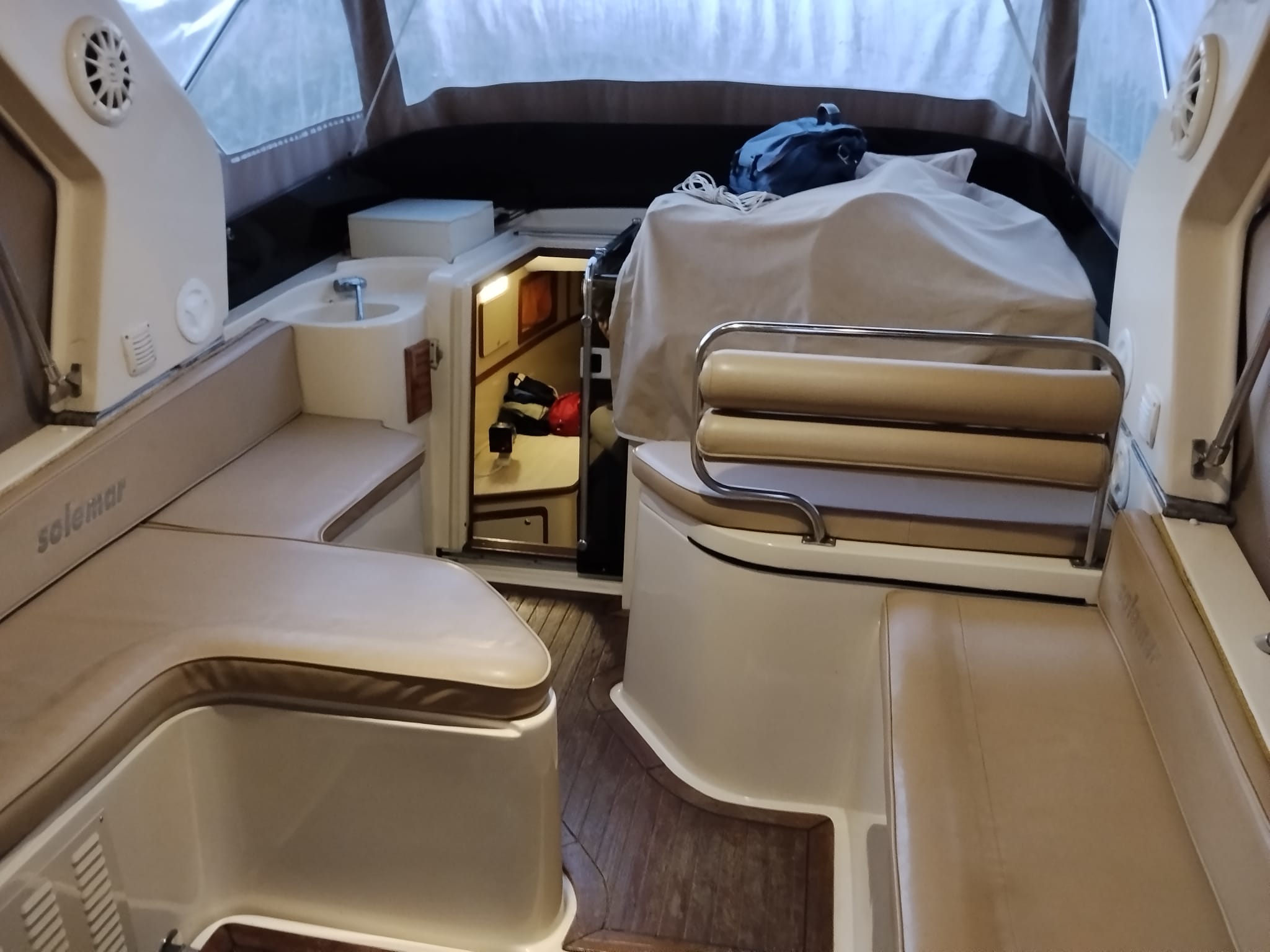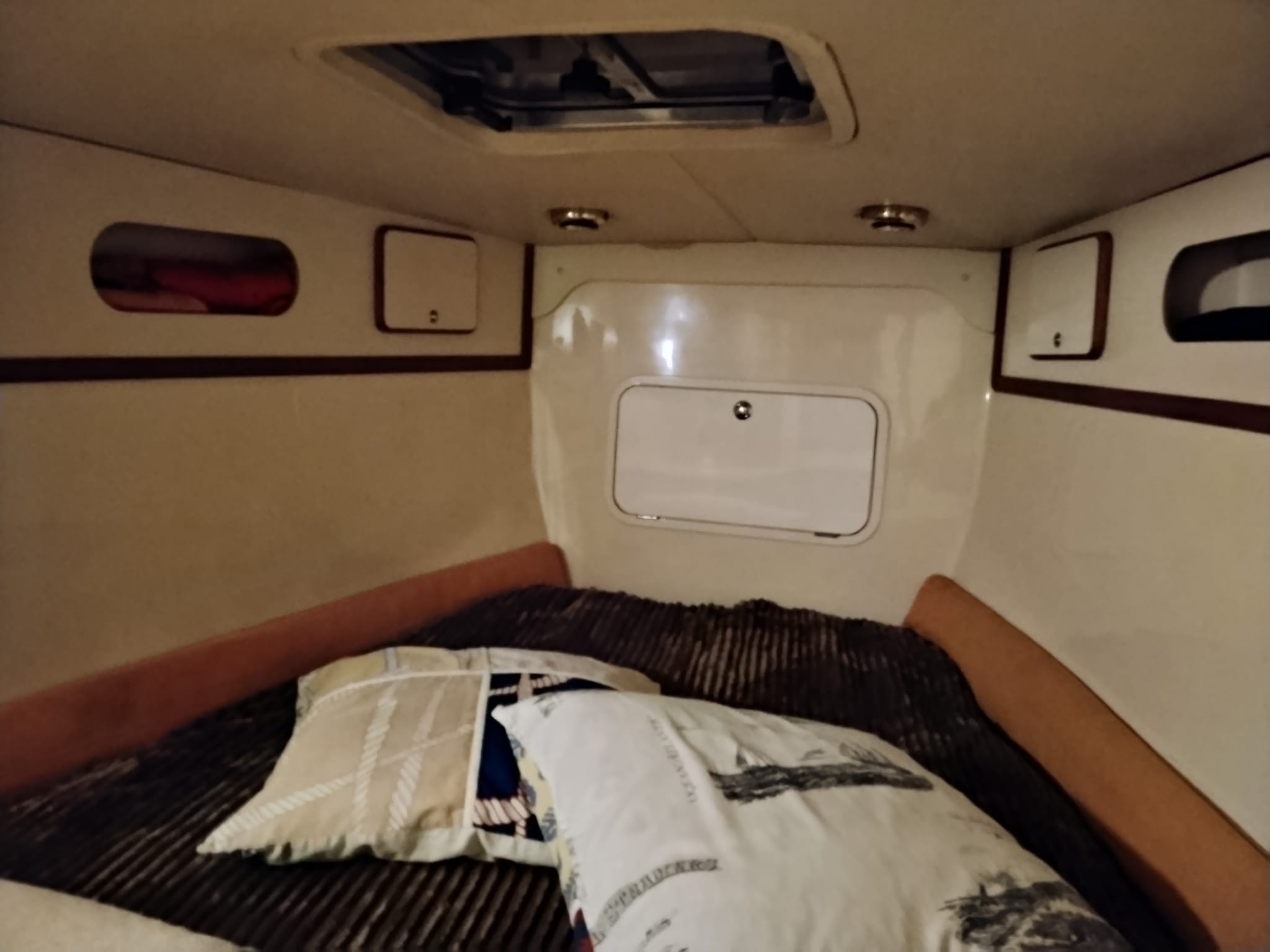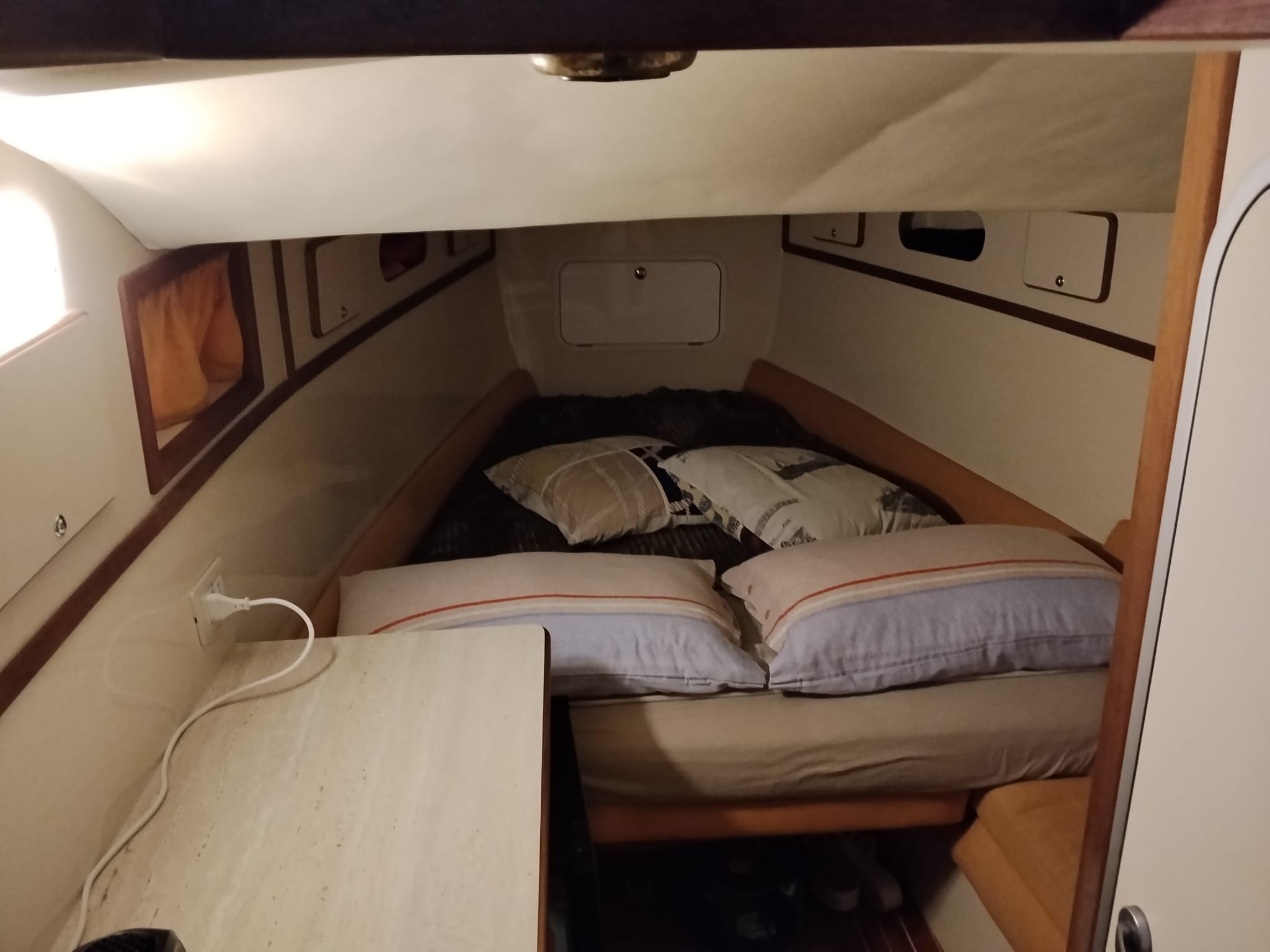 Internamente, letto matrimoniale a prua con materasso supplementare su misura, bagno in locale separato con doccia.