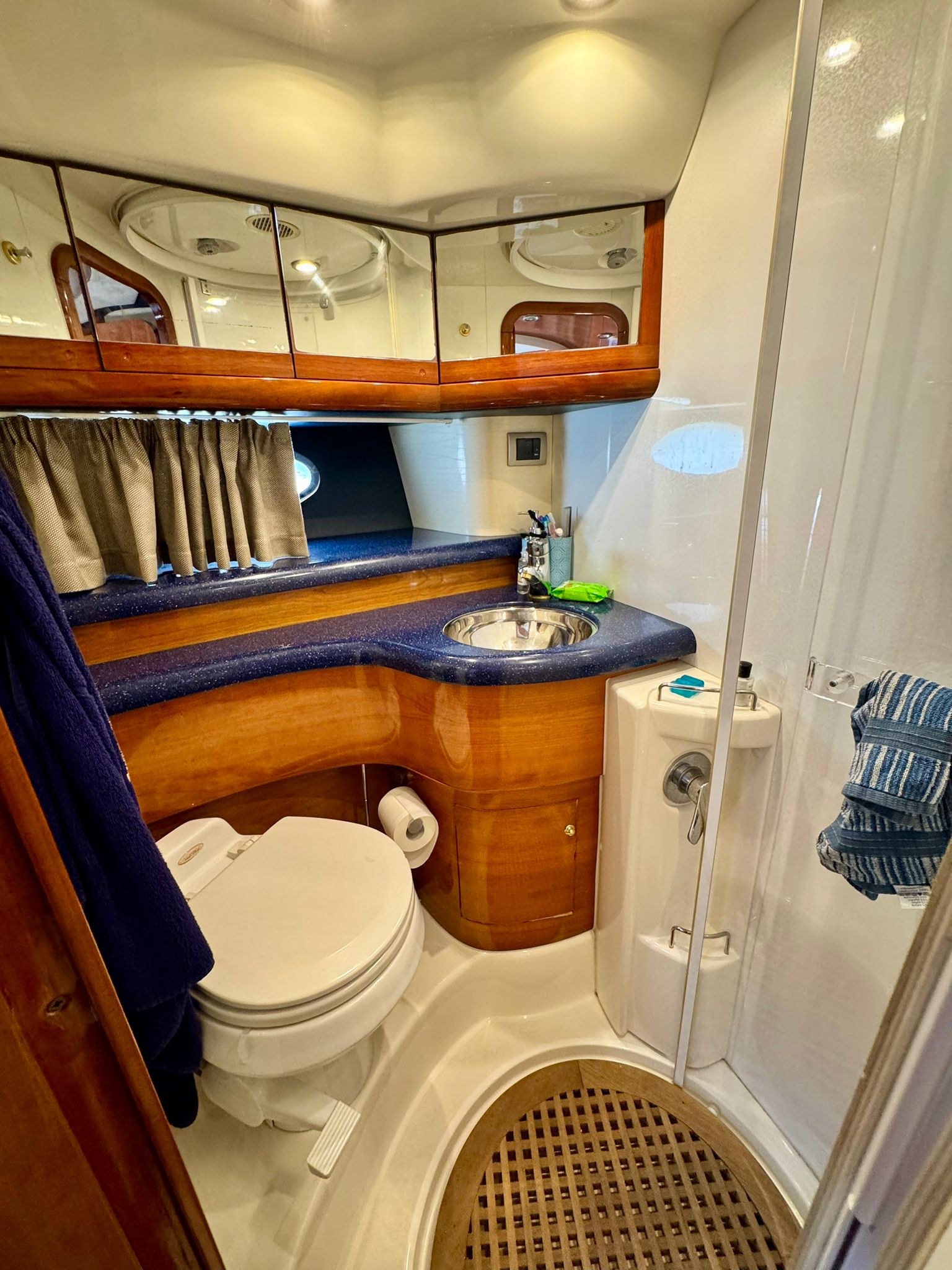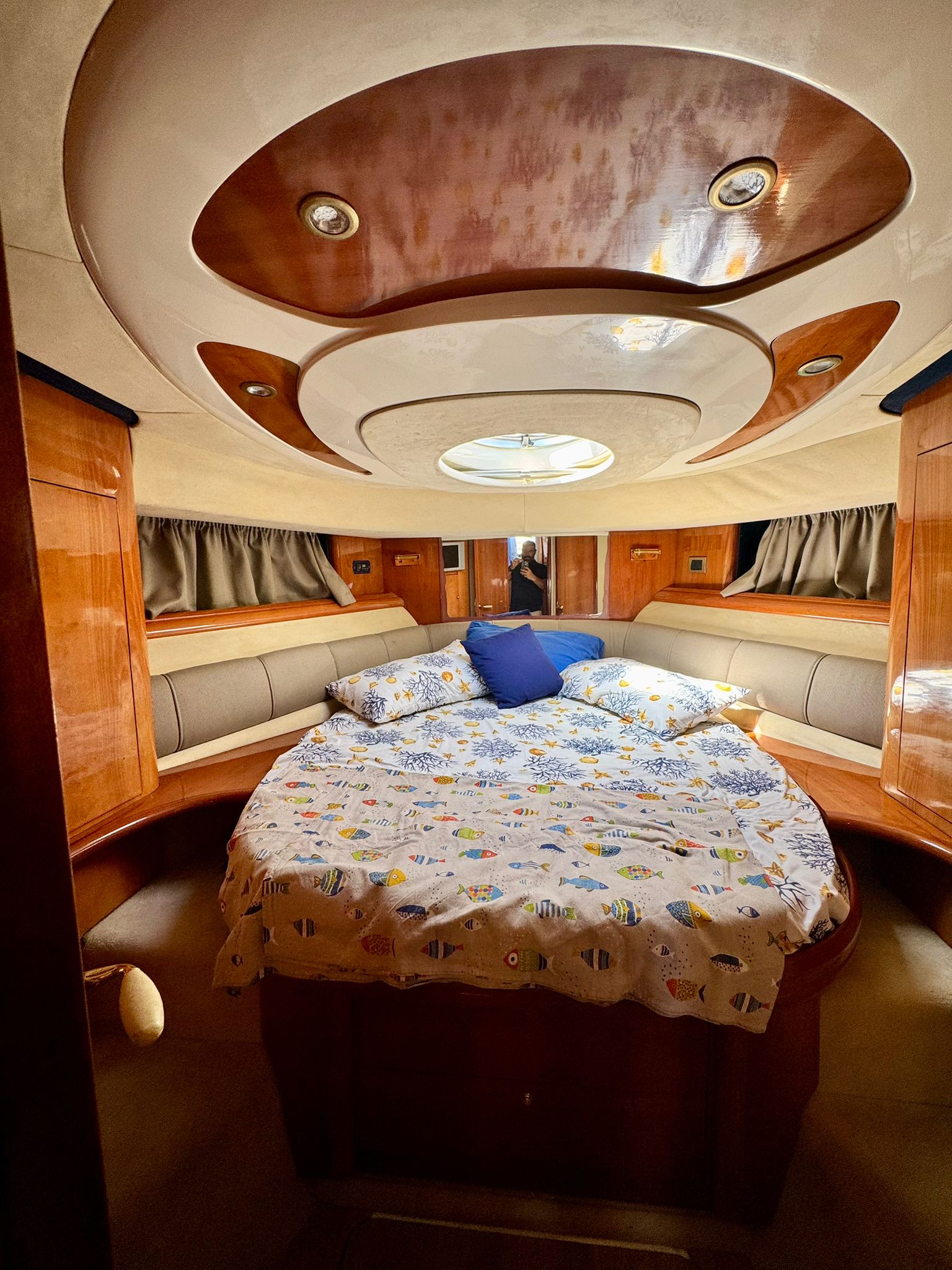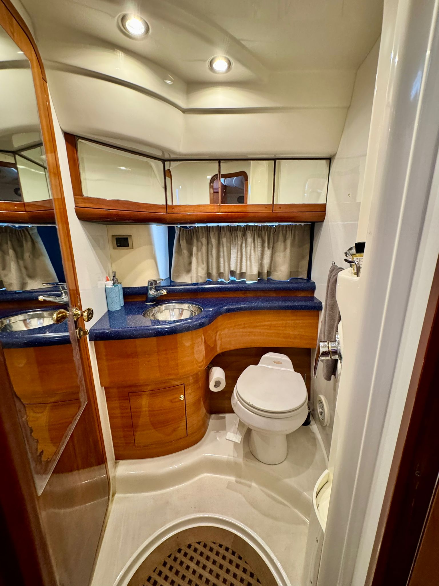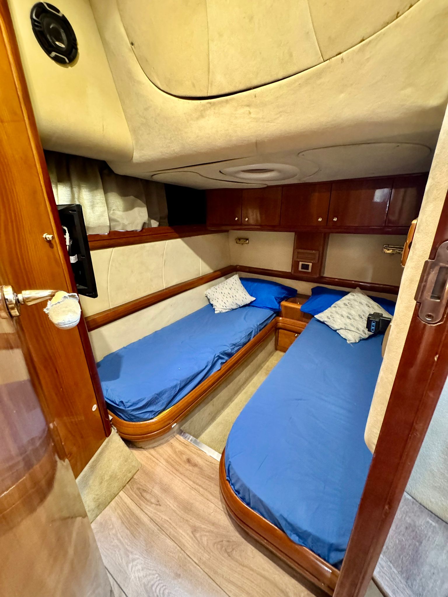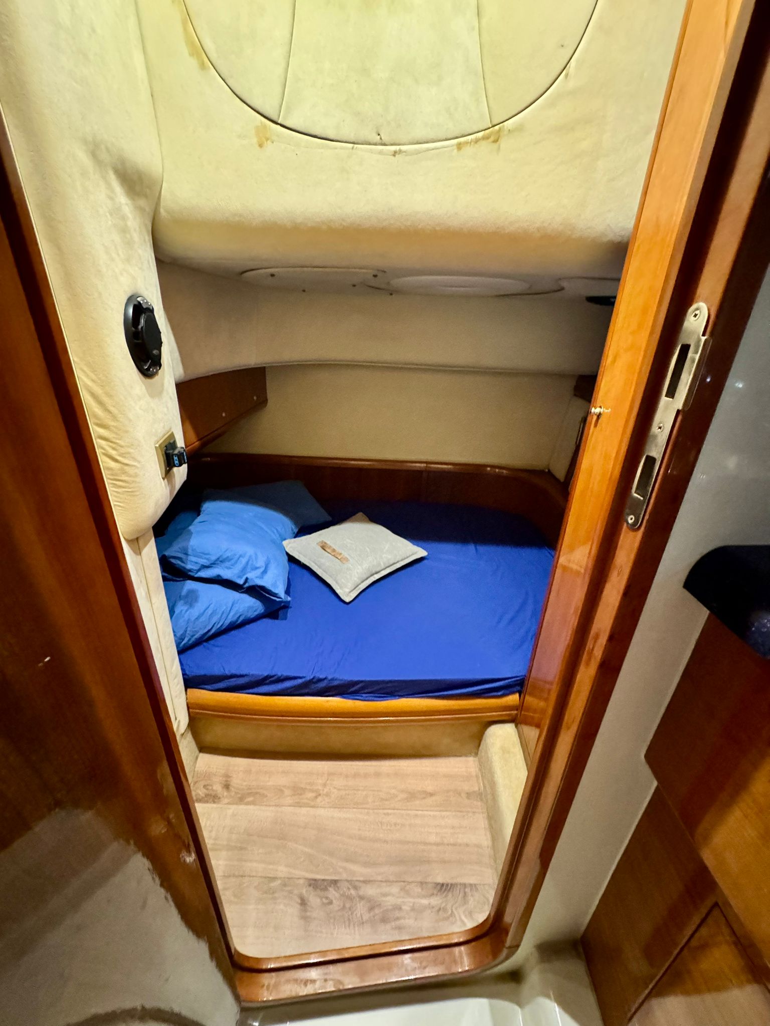 Sempre a centro nave si ha una toilette di servizio con wc lavabo e box doccia, mentre a prua via si ha la cabina armatoriale con toilette en suite, mentre le cabine ospiti a poppa via sono con 2 letti singoli in piano.