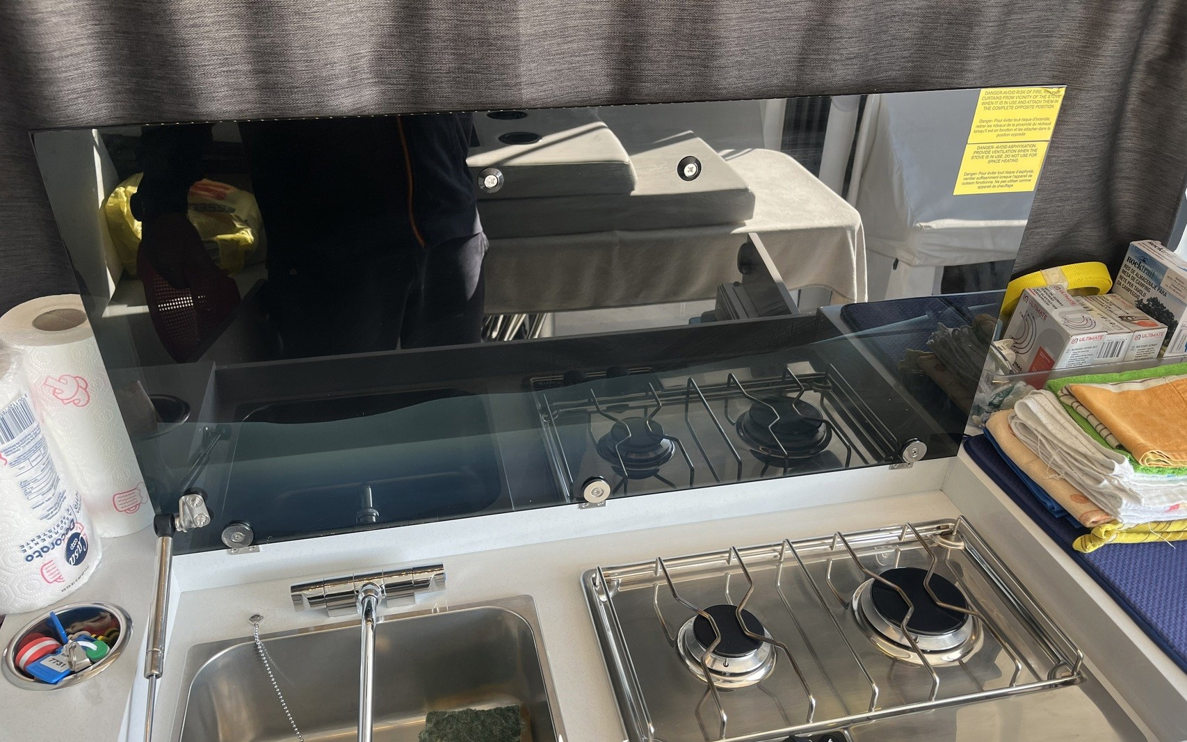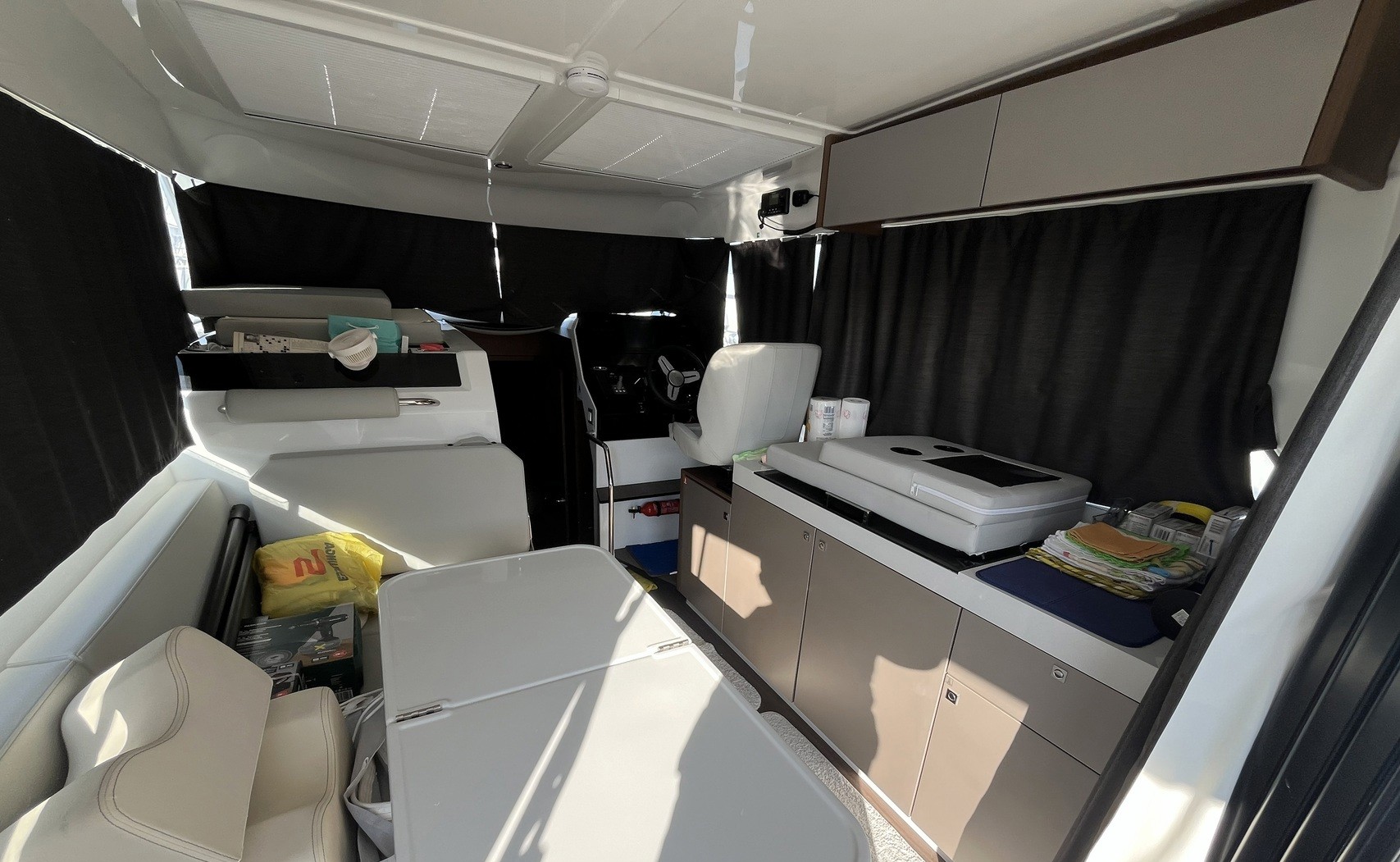 Internamente troviamo una dinette con postazione di comando, cucinotto con frigorifero lavello e doppi fuochi a gas, e tavolo.