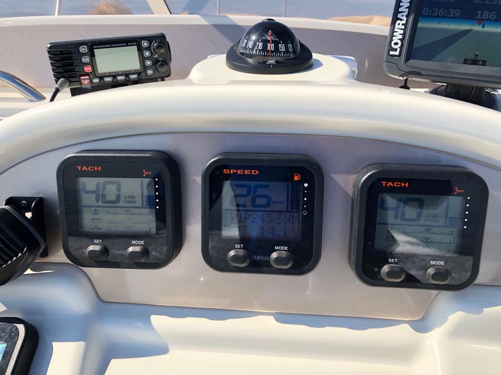 Descrizione motore 2 x 150Hp Yamaha anno 2010 con appena 210 ore di moto. Tagliandi regolari. Consumi a vel crociera 26/27 nodi 45 lt/h complessivi; a 21/22 nodi 37 lt/h complessivi; vel max oltre 40 nodi.